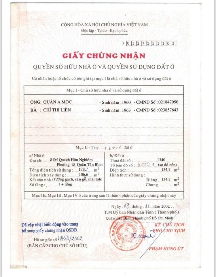 Bán nhà mặt tiền 3 lầu 5PN số 22 Quách Hữu Nghiêm Q.Tân Phú