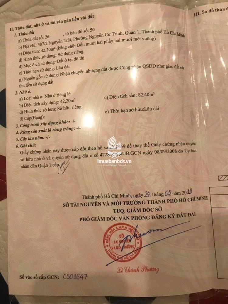 Bán nhà 387/2 đường Nguyễn Trãi, P. Nguyễn Cư Trinh, Q1- Diện tích đất : 42.2m2 - DTSD : 82.4m2 - Hẻm xe hơi 6m - ĐC : 387/2 Nguyễn Trãi Phường Nguyễn Cư Trinh Q1 - Kết cấu: 1 trệt 1 lầu gồm 2PN, 2WC- Pháp lý: Sổ hồng riêng.- Tiện ích: Giao thông thuận tiện kết nối Trần Hưng Đạo, Cống Quỳnh, Bùi Viện, Võ Văn Kiệt...- Chỉ vài phút là vào trung tâm tài chính hoặc sang các quận lân cận: Q3, Q5, Q10, Q4.- Gần phố đi bộ Bùi Viện, chợ Thái Bình, công viên 23/9, chợ Bến Thành.- Gần các siêu thị tiện lợi, Vinmart, Bách Hóa Xanh, ngân hàng, trường học các cấp.- Giá bán: 9.8 tỷ(TL)- LH chính chủ : 0901388616 Chị Ngân